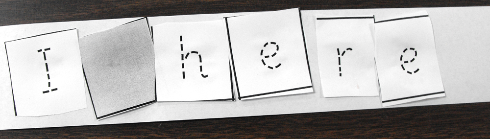 Today, students cut individual letters apart, spelled the word wall words for the week, and then glued them to adding machine tape. Students made certain that there were spaces between their words by placing a grey square between the ending of one word and the beginning of the next word.